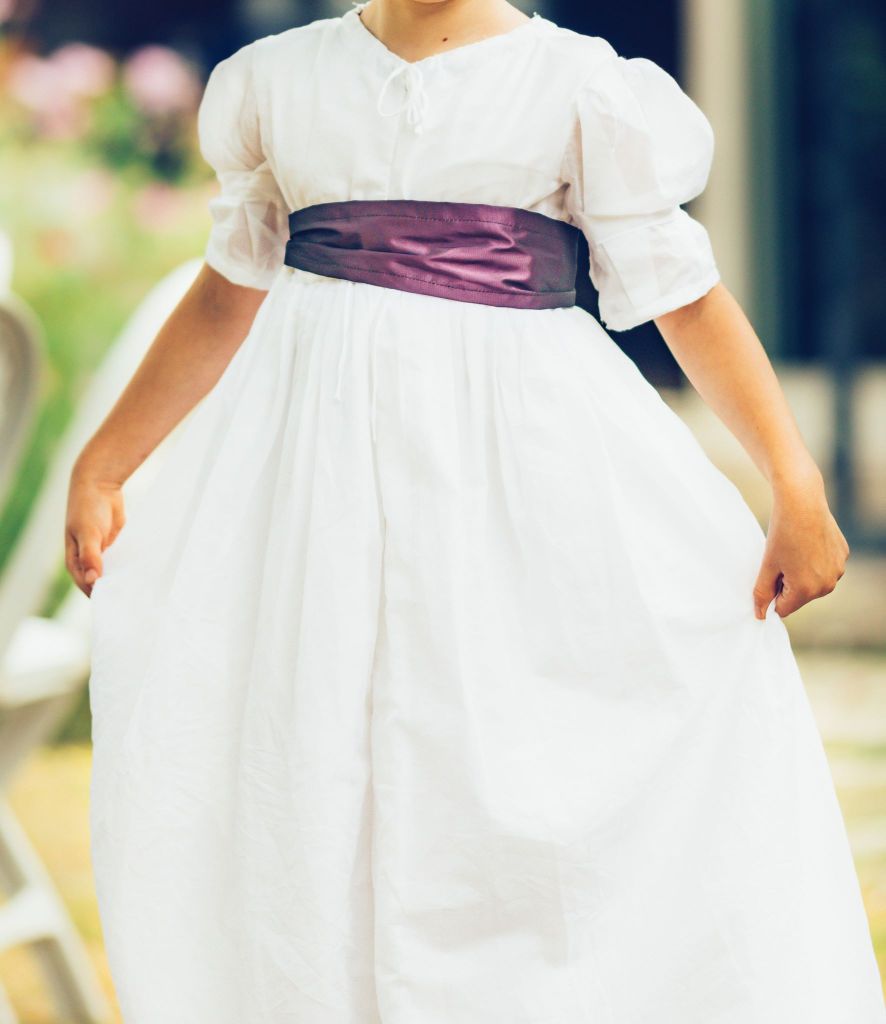 La fin du XVIIIe siècle voit la naissance d’une mode enfantine. Inspirée de la célèbre « robe de gaulle » de Marie-Antoinette, les fillettes et/ou adolescentes se parent de ces robes chemises blanches aux ceintures colorées.